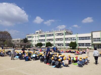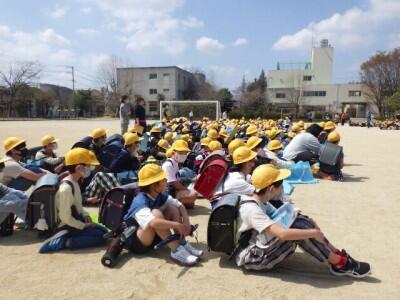 校庭に地区ごとに集まって、一斉下校を行いました。