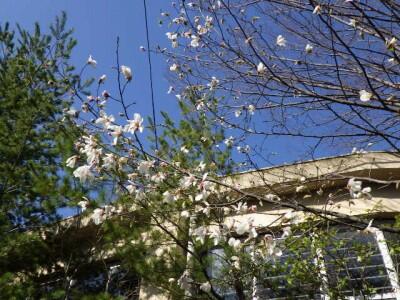 ハクモクレンが子どもたちを迎えます。