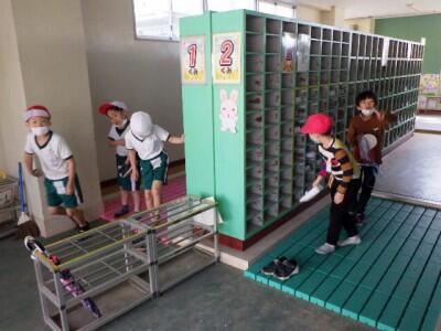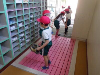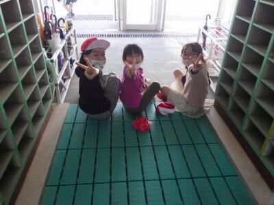 卒業記念品としていただいたカラーすのこの上で、靴をはき替えます。