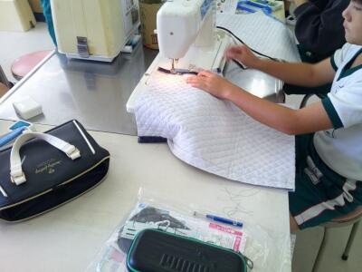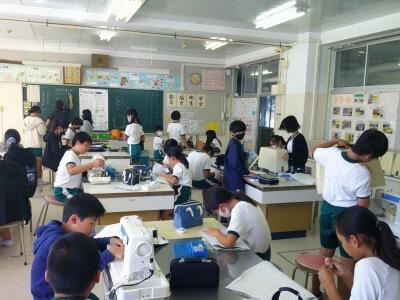 6年生が家庭科でミシンと向き合っていました。
