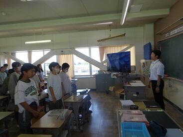 大型モニターから校長先生があいさつすると、みどりっ子も元気いっぱいあいさつしてくれている声が