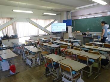 大型モニターから校長先生があいさつすると、みどりっ子も元気いっぱいあいさつしてくれている声が