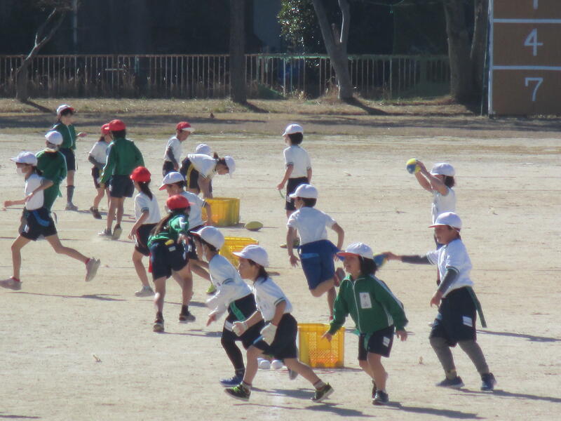 2年生ボール運び鬼 あたたかい日差しの中、汗をかきながら体育の授業で体を動かします。