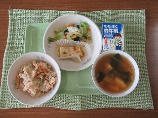 本日は、こぎつねごはん、いかのごまマヨネーズやき、甘酢和え、のっぺい汁、牛乳でした。