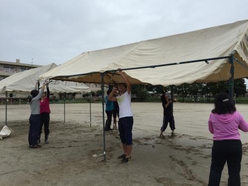 先生たちで、明日のために、テント張りや万国旗つけをしています。雨はやみ、晴れ間も出てきましたが、校庭はぬかるんだままです。