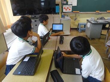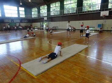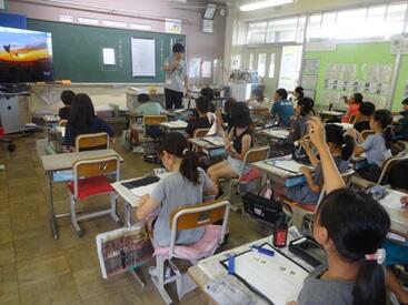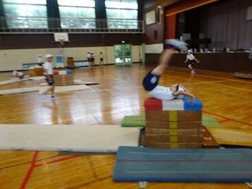 7月末に5年生は林間学校に行きます。林間学校に行くための準備をしながら、勉強にも力を入れていている5年生です。上の写真は跳び箱です。回転系の技に挑戦中。とてもダイナミックな動きです。下の写真は総合的な学習の時間で、各自で調べたことを発表しています。