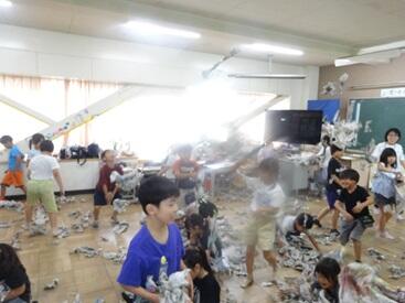 2年生の教室からとても楽しそうな声が聞こえてきました。見てみると新聞紙を使ってみんな楽しそうにしていました。新聞紙を丸めたり、ちぎったり、投げたりなどなど、楽しそうに遊んでいました?