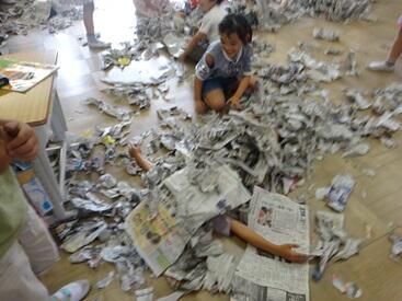 実は遊びではなく、図工の時間です。新聞紙を使った造形遊びです。みんな楽しそうでした!