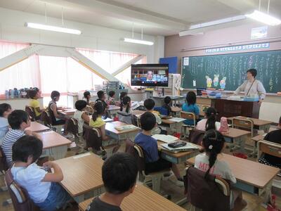 大型モニターから校長先生があいさつすると、みどりっ子も元気いっぱいあいさつしてくれている声が
