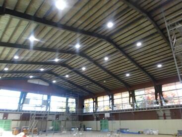 現在体育館エアコン設置工事を行っていますが、今朝体育館に行ってみると、照明がLEDにかわっていました。これまでの照明は、スイッチを入れてもすぐに点灯しませんでしたが、これからは違います。スイッチを入れるとすぐに点灯します。そして何より明るい! 完成が楽しみです。