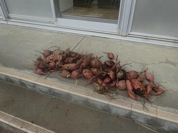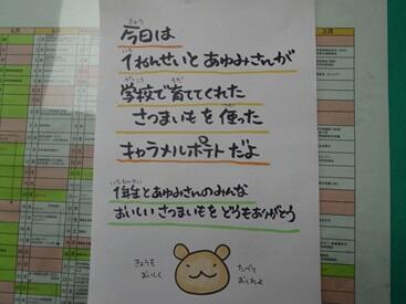 今日の給食に、「キャラメルポテト」が出されました。さつまいもを油で揚げて、砂糖やキャラメル粉をまぶしたものです。このさつまいもは、下の写真にあるように、1年生とあゆみ学級のみんなが育てて、10月に収穫してくれたさつまいもです。外はカリカリ、中はホクホク。さつまいもの甘さと砂糖の甘さが合わさり、とてもおいしくいただきました。栄養士の先生からのメッセージです。「おいしいさつまいもをどうもありがとう」
