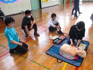 職員研修で心肺蘇生法講習会を実施しました。毎年行っていることではありますが、命をお預かりする仕事をしているという責任と、万が一の時に素早く適切に対応できるようにするため、年度当初に設定しています。春日部消防署の方から説明を受けながら、胸骨圧迫法やAEDの使い方について実践しました。私たち教職員は、「万が一の事態が起こらないように、予防をしっかり」を胸に、日々の教育活動を進めてまいります。
