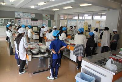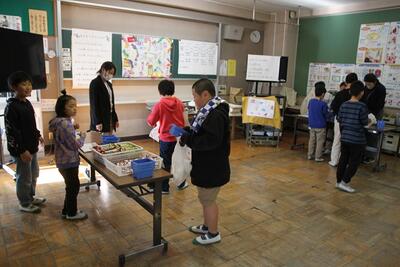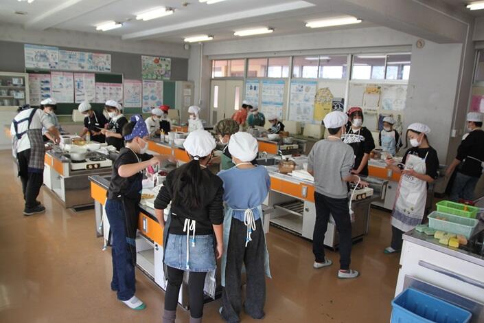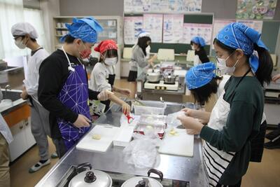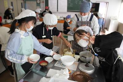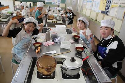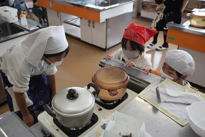 5年生の家庭科では、ご飯とみそ汁の学習をします。お米は、学校応援団の方にお手伝いいただき、自分たちで田植え、稲刈りをした春日部産のお米です。お米を吸水させている間に、煮干しでだしをとったみそ汁をつくったら、いよいよお米を炊きます。ほんのりおこげができる感じに、上手に炊き上げることができていました。