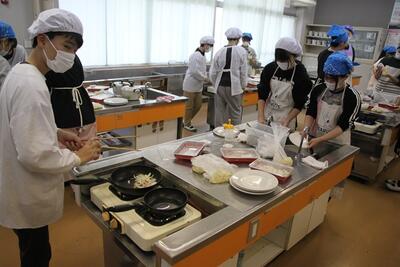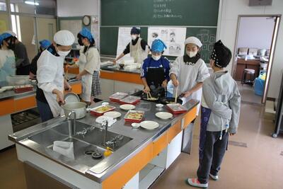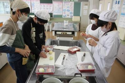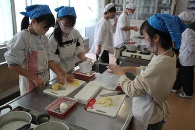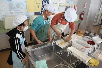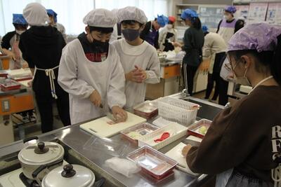 昨日に引き続き、6年生の家庭科の様子です。今日は昨日とは別のクラスが調理実習をしました。早く火がとおるよう、材料の厚みに気をつけながら切っていきます。昨日のクラスに負けず劣らず、上手に仕上げることができていました。お家でも是非、実践して欲しいですね。