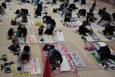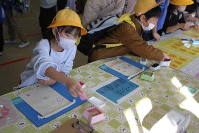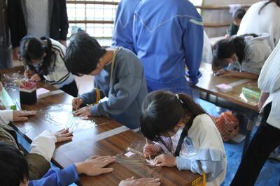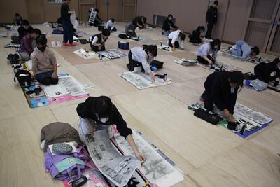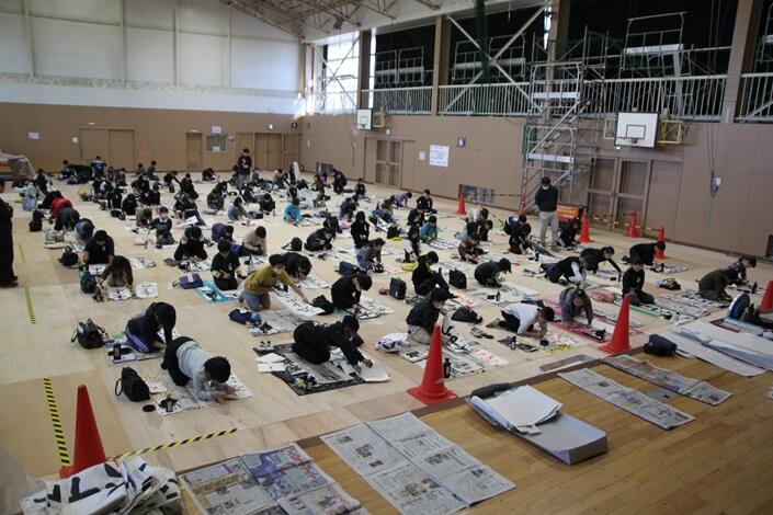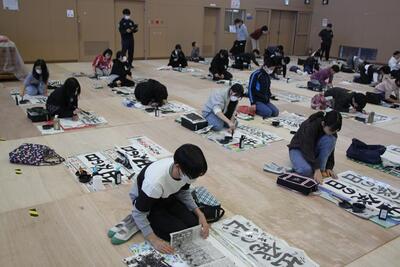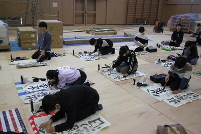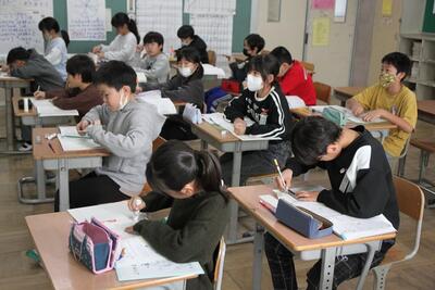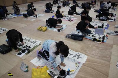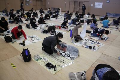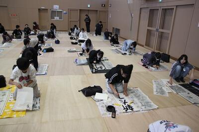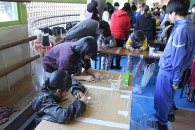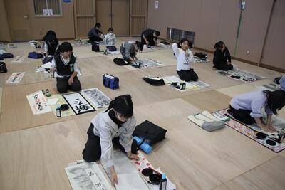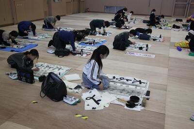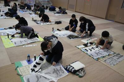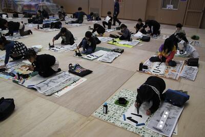体育館に3・4年生が集まり、競書会を行いました。空調工事の関係で、やや狭いところではありましたが、みんな集中して作品づくりに取り組んでいました。