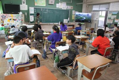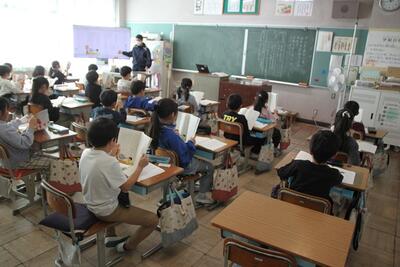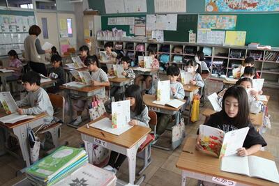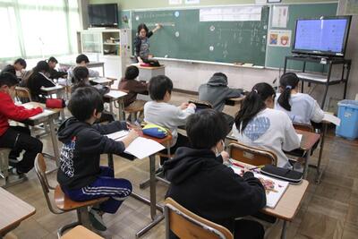 2年生の国語では「みきのたからもの」というお話をもとに、場面の様子を想像するなどしながら学習しています。みんなでお話を読みながら、登場人物の様子などについて考えています。