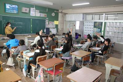 4年生の算数では学年を3つのクラスに分ける少人数の授業を行っています。今日は仮分数と帯分数を比べる学習をしています。数直線を利用して考えています。