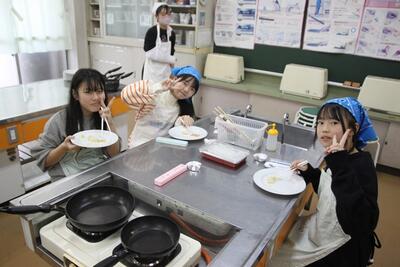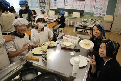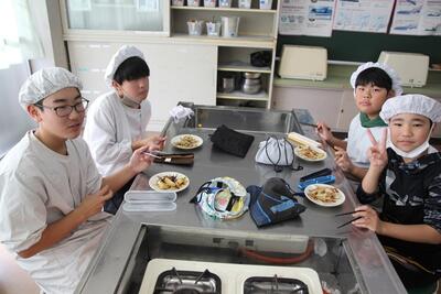 6年生の家庭科では調理実習でジャーマンポテトをつくっています。ジャガイモの皮むきをしてゆでたら、玉ねぎ、ベーコンを加えて炒めます。皮むきに苦労をしているこもちらほら。でも、出来上がりは上々。おいしそうに食べていました。