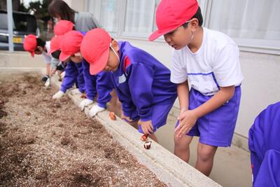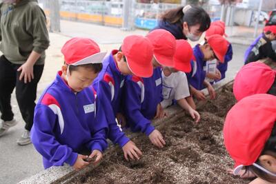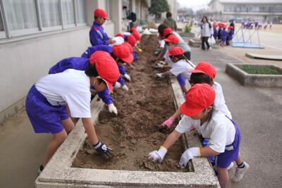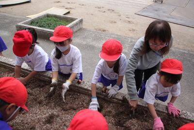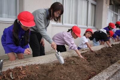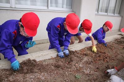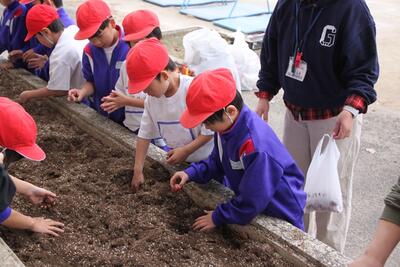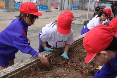 1年生の生活科では、春に向けて植木鉢に花の球根を植えました。また、植木鉢だけでなく、校舎の花壇にもみんなで協力して球根を植えました。春になって花が咲くのが楽しみですね。