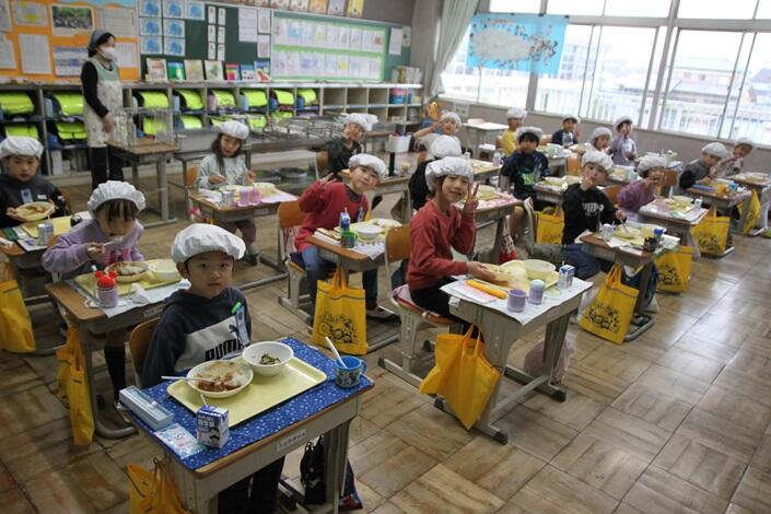 1年生の給食の様子です。今日の献立は、味噌ラーメン、牛乳、揚げ餃子、茎わかめ入りサラダです。おいしくいただきます。