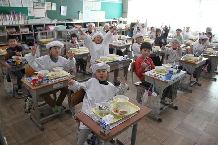 2年生の給食の様子です。今日の献立は、ご飯、牛乳、あじの味噌だれ、炒めなます、吉野汁です。おいしくいただきます。