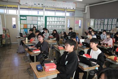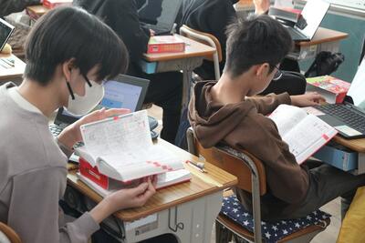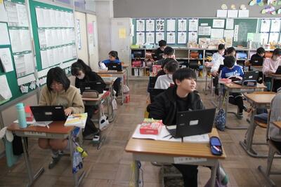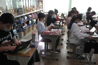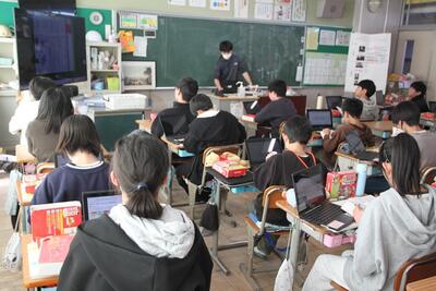 6年生の国語では「同音異義語」について学習しています。辞書を使って調べながら、タブレット端末に同音異義語の問題を作成していきます。みんな興味をもって真剣に学習していました。