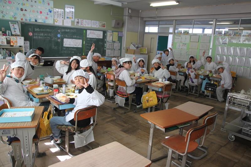4年生の給食の様子です。今日の献立は、ご飯、牛乳、メンチカツ、じゃことキャベツの和え物、たぬき汁です。おいしくいただきます。