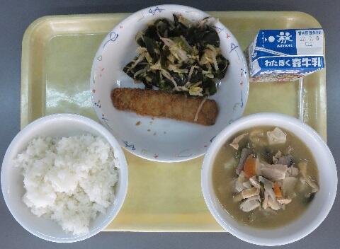 本日の献立は、ご飯、きのこ汁、れんこんのはさみ揚げ、和風サラダ(醤油ドレッシング)、牛乳でした。