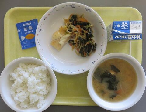 本日の献立は、ご飯、小魚ふりかけ、いかの味噌マヨネーズ焼き、味噌けんちん汁、白菜のおひたし、牛乳でした。