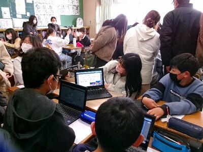 5年生が、総合的な学習の時間でグループごとに調べた内容を、学年の仲間に発表する「総合学習発表会」を行っていました。