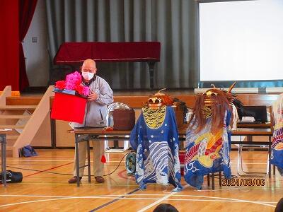 5校時に、西金野井獅子舞保存会の方にお越しいただき、お話を頂きました。
