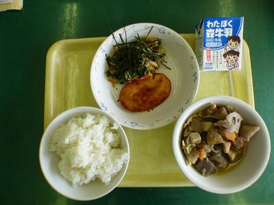 本日の献立は、ごはん、ハンバーグプルーンソース、ポトフ、ビーンズサラダ、ノンオイルフレンチドレッシング、牛乳でした。
