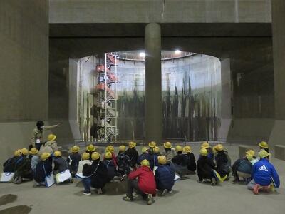 ↓もう1つのグループは、模型を見ながら外郭放水路の仕組みを学ぶ