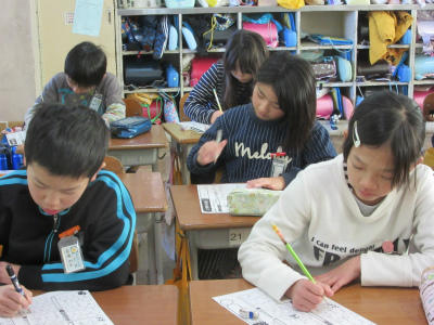 今日から、3年生以上の学年で、市検証テストの事前取組シートが始まりました。計算や図形の問題など、しっかりと取り組んでいました。