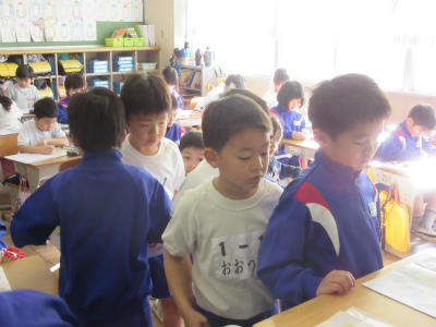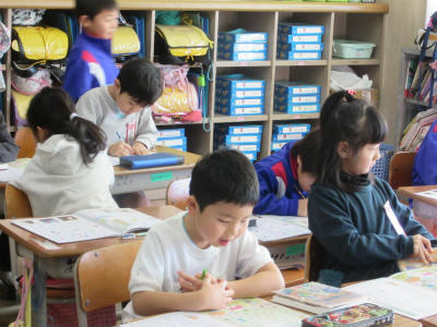 1年生は、カタカナの学習をしていました。大きな字で、カタカナのしくみをしっかり頭に入れていました。正しく書けるといいですね。全部できると、丸付けに並んでいます。