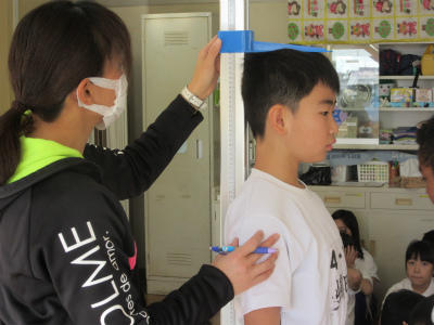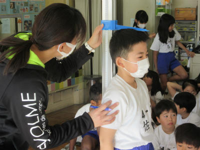 保健室で、4年生が発育測定をしていました。身長は1mmでも高く、体重は1kgでも軽くという感じで測っていたようです。休み中に、どの子も大きくなりました。