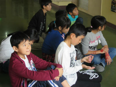 1年生が、体育館でマットあそびをしていました。今日は、後ろ回りを練習していました。なかなか手の着き方がうまくできなくて苦戦していたようです。後転が早くできるといいですね。