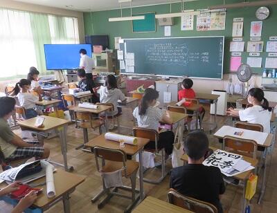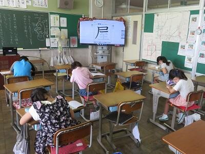国語の授業中、漢字ドリルを使った学習を行っていました。ここでもタブレットPCと大型モニターを使って授業を行っていました。自動で漢字の書き順がわかる画面が投影されていました。子どもたちは、時折、大型モニターを見て、書き順を確認していました。