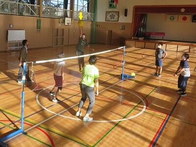 この日も、3本の研修が組まれました。特別支援教育に関する事例研修会、教育課程伝達研修会、体育の指導案検討会を行いました。体育の指導案検討会のあと、実際にそのとおり授業が展開できるか、実際にソフトバレーボールを体験し、指導案修正を行いました。