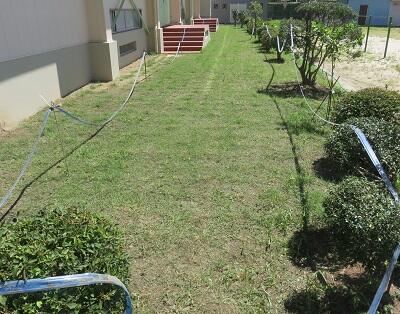 7月6日に植えた芝生が、順調に伸びています。夏休みに入り、人手も不足しており、雑草との戦いになっています。学校の近くにいらした際には、芝生の様子もみていただけると幸いです。できれば、草抜きも少しでいいのでお手伝い願えると有難いです。