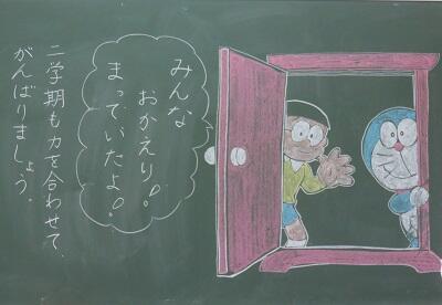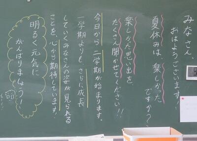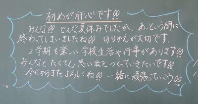 残念ながら、感染者数急増の影響で9月10日まで分散登校となりましたが、日焼けした子どもたちが元気に登校してきました。数日前から新学期の準備をしていた先生方は、黒板にメッセージを記し、子どもたちを迎えていました。