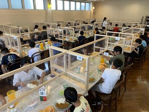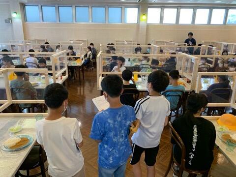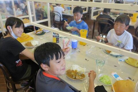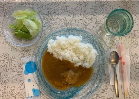 林間学校二日目の昼食は、チキンカレーとサラダです。(12:00)