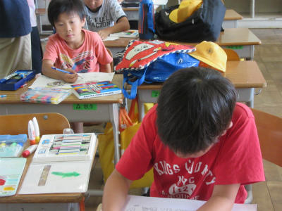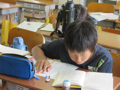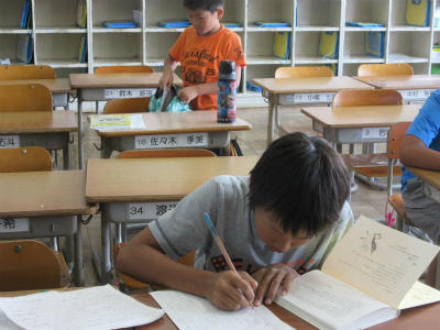 5教室に分かれて、習字をやっている子、必死に読書感想文をやっている子、ポスターを描いている子を応援していました。夏休みのよい作品ができるといいですね。