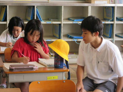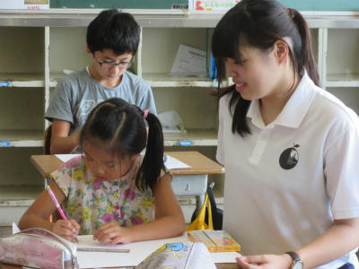 寺子屋が2日目になりました。今日も、習字・読書感想文・ポスター等のお助けマンに大学生たちが来てくれていました。