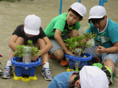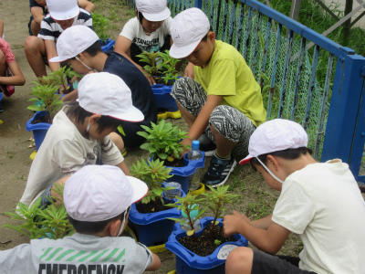 3年生が、ホウセンカの植えかえを行っていました。よく育っている苗だけを残して、大きく育つようにさせました。しっかり世話をしてください。