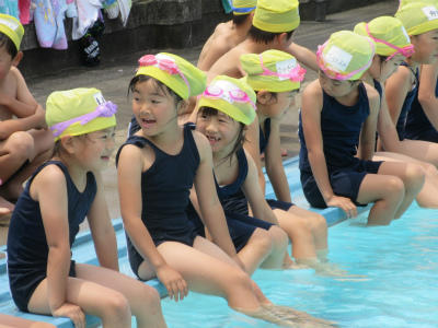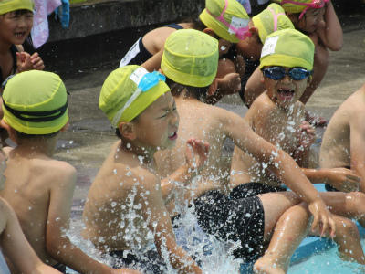 1年生が、初めての水泳学習をしていました。とっても喜んでいました。冷たい・冷たいと言いながら、楽しんでいました。