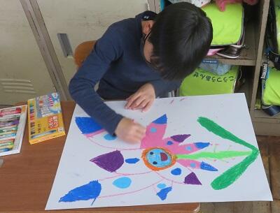 1年生が、6年生に感謝の気持ちを伝える「花の絵」を描いていました。『心の花を咲かせよう』というテーマで、ひとりひとりが、お世話になった6年生を思い浮かべながら、紙いっぱいに伸び伸びと大きく描いていました。どの花も、明るく、元気な花でした。