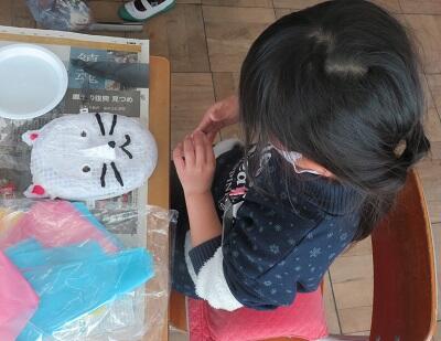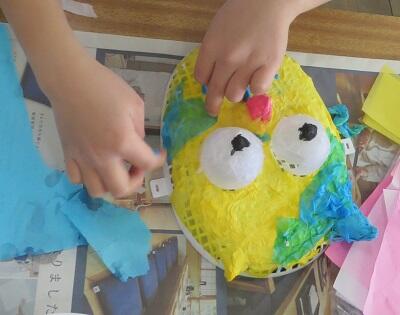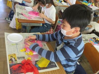 2年生が図工の作品をつくっていました。顔の形をした白いプラスチックに、お花紙をちぎって、ボンドを水で溶いたのりをつけて、順々に貼っていました。それぞれに変身したい顔があるようで、黙々と紙をちぎっては貼る作業を繰り返していました。