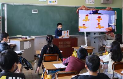 総合的な学習の時間 紙芝居で発表します 大きくなってよく見えますね。