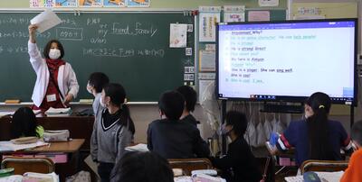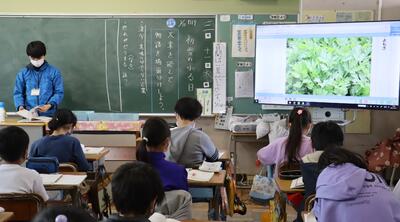 今年度導入された65インチの大型モニターをタブレットや書画カメラとつなぎ 様々な学習で活用しています。